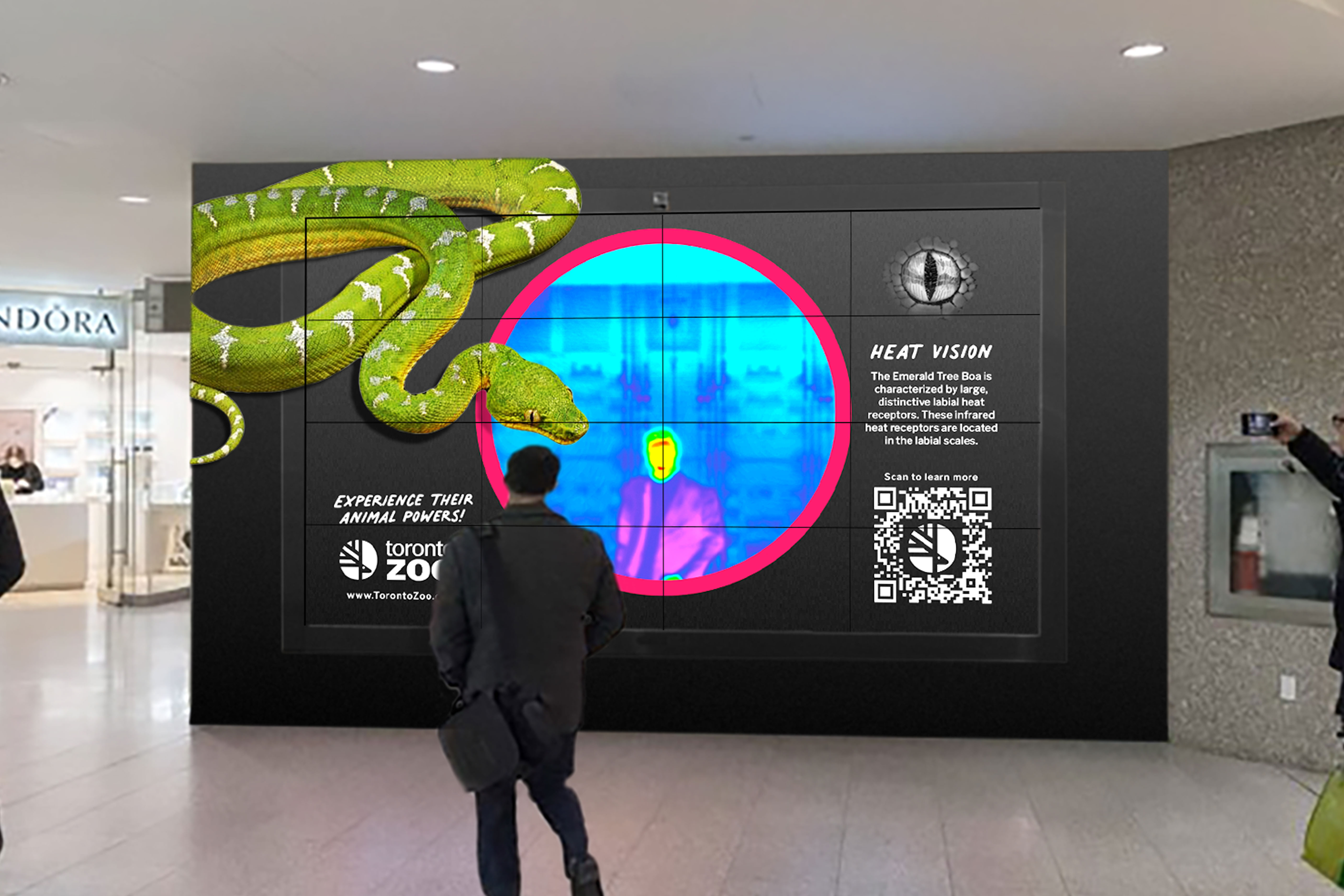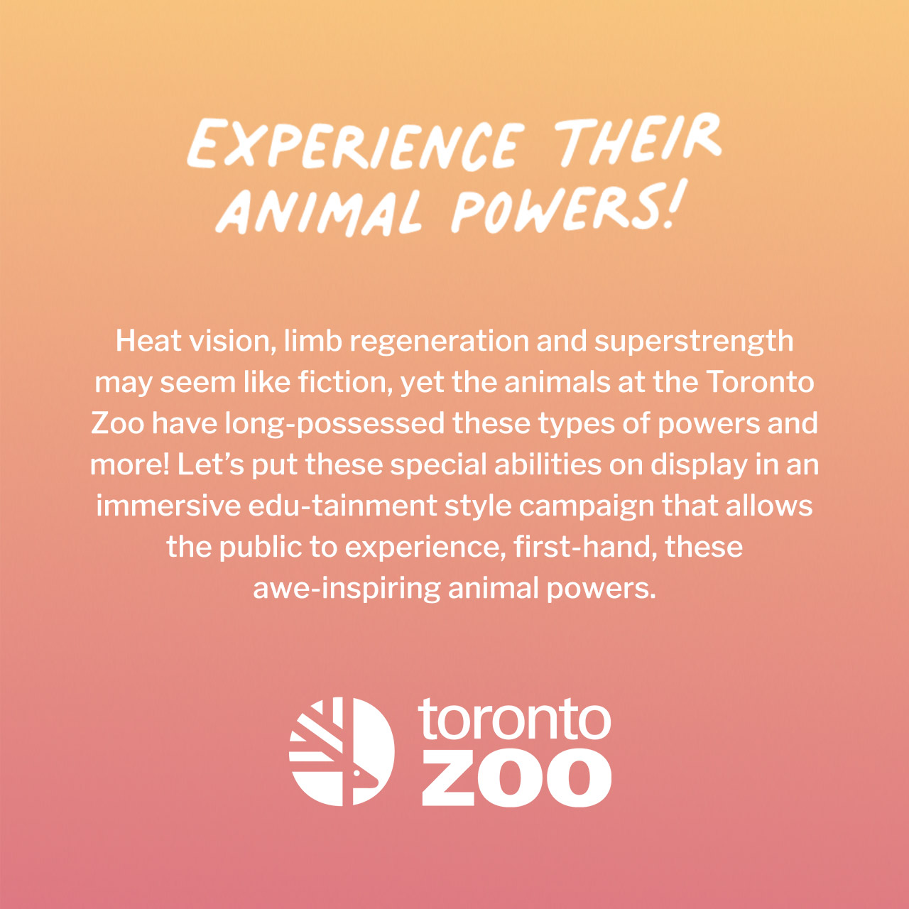 The Animal Powers creative concept focused on one of the zoo’s core communication pillars, educating the public. The idea was focused on the simple insight that many species in the animal kingdom possess super abilities that our culture is fascinated by, and dream of experiencing, we’ve all heard someone ask “what would your superpower be?” Heat vision is a reality for the Boa and the Komodo Dragon can sense food from 8km away by tasting the air. How cool is that! The creative concept allows the public to experience these animal powers first-hand through an immersive edu-tainment style campaign that will test the interactive abilities of media while educating the public.